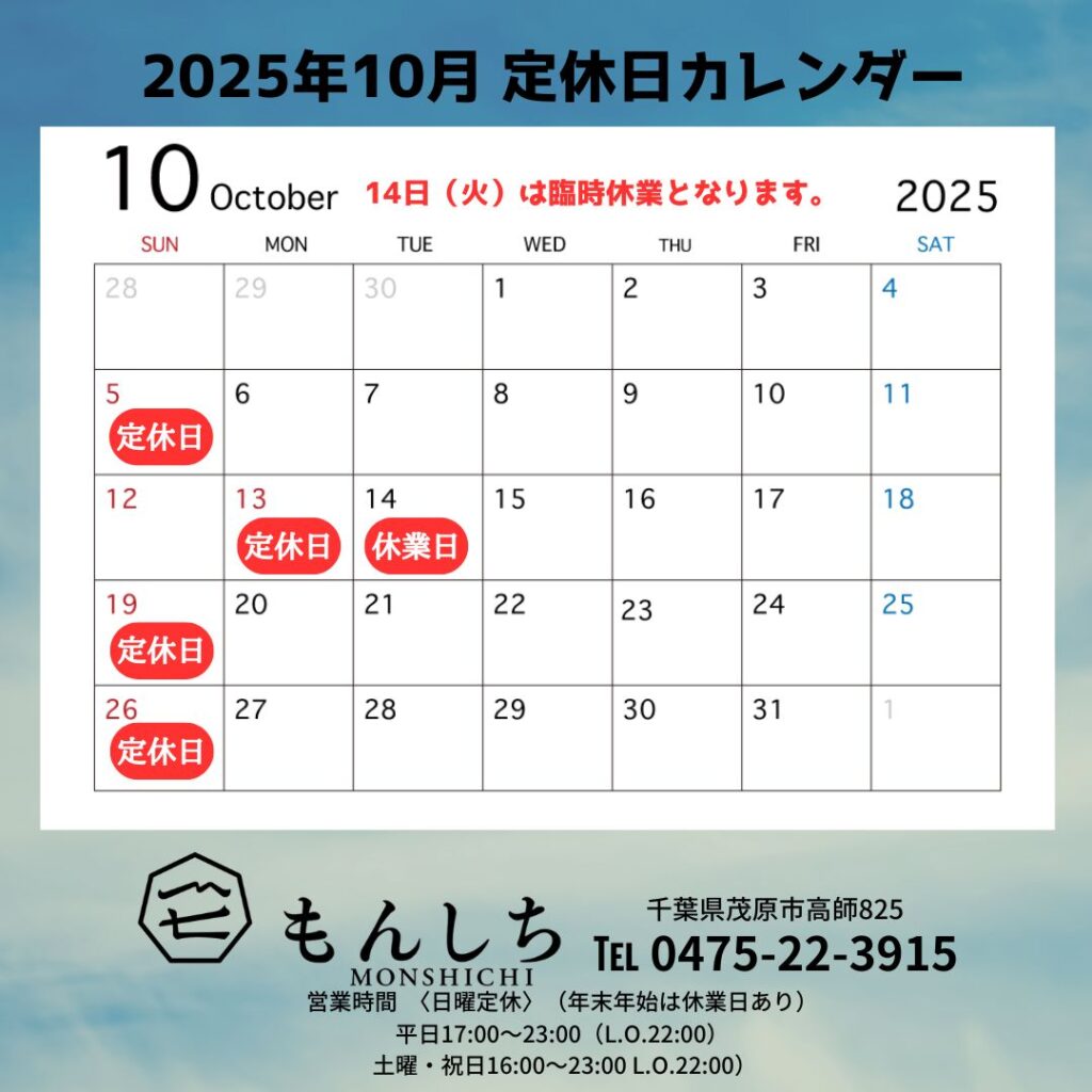 10月の営業カレンダーです。 2025年9月28日 最終更新日時 : 2025年9月28日 monshichi 10月の営業カレンダーです。 10月14日(火)は臨時休業となります。 10月もよろしくお願いします。
