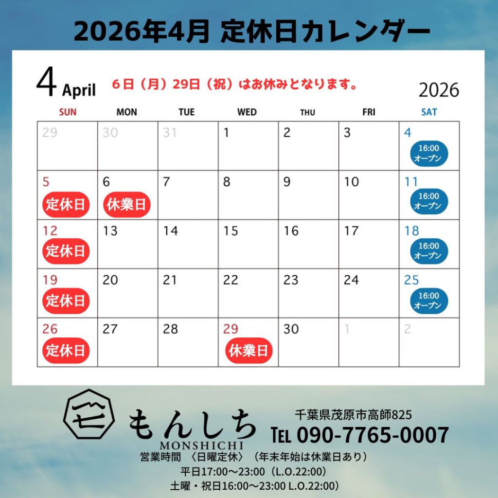 6日(月)と29日(祝)はお休みとなります。